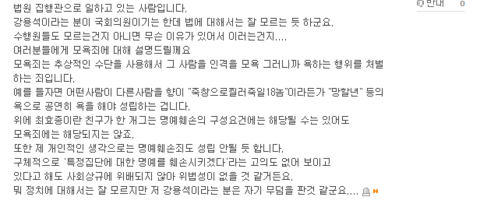 또 강 의원은 "공약을 얘기할 때는 그 지역에 다리를 놔준다던가 지하철 역을 개통해 준다던가, 아~ 현실이 너무 어렵다구요? 괜찮아요. 말로만 하면 돼요" 라는 발언도 모욕죄에 해당한다고 지적했다.
