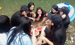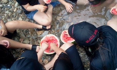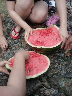 아이들이 수박보고 너무 광분하고 흥북한 나머지 수박물이 계곡물로 유입되는 상황이 발생함