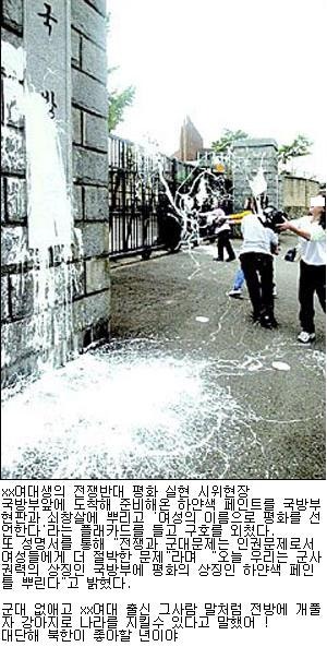 이라 발언하고 이대학 여대생들이 국방부에 흰색 페인트를 뿌리며