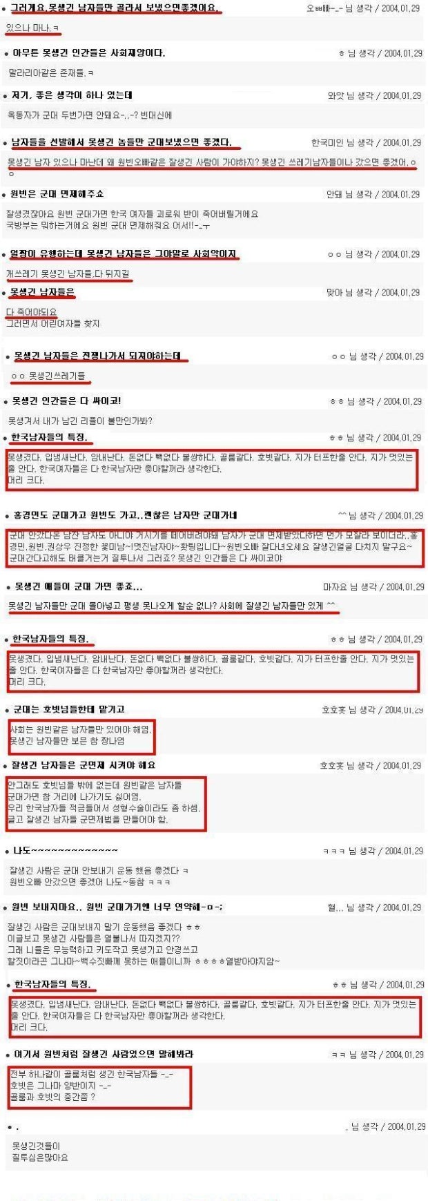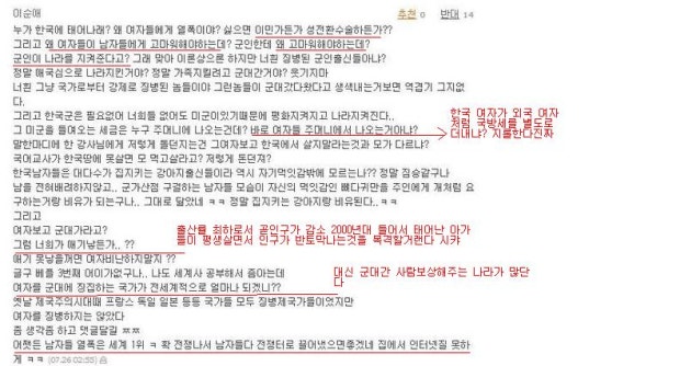 "전쟁나면 남자가 총알받이하고 미군이 와서 싸우겠지 ㅋㅋㅋ