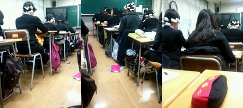 오늘 2교시 국사시간, 아니 어떤 한 아이가 자기 짝지 머리를 종이파마 해주고 있는게 아니겟슴?!!!!![]()