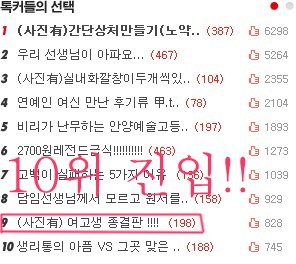 드디어 10위권 안에 들었어요! 저희 판이 톡커들의 선택 9위!