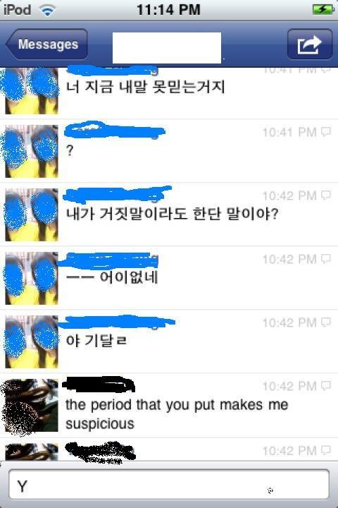 the period that you put makes me suspicious> (뜻) 니가 "진짜라니까"뒤에 찍은 쩜이 의심스러워.