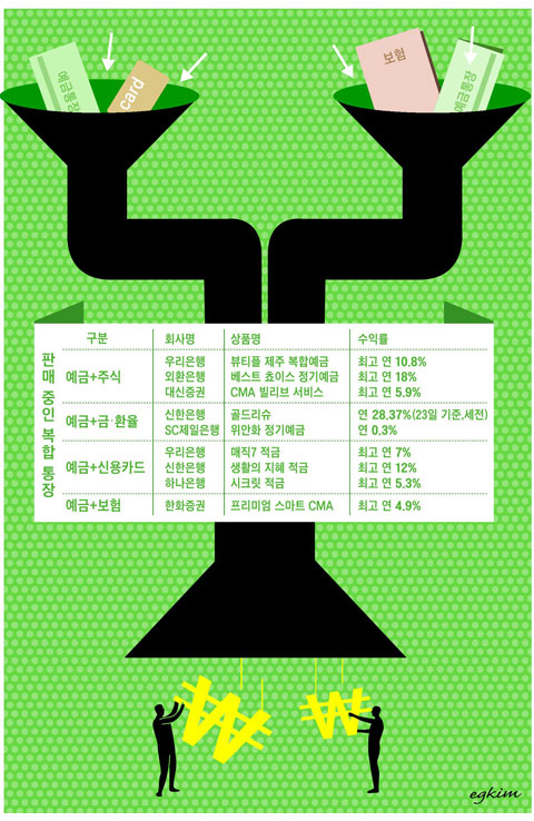증권사들도 복합통장 판매에 적극 나서고 있다. 대표적인 상품이 종합자산관리계좌(CMA)다. 이 상품은 고객이 맡긴 예금을 투자금융회사가 단기국공채나 기업어음, 양도성예금증서 등에 투자해 수익을 낸다. 대신증권은 국내외 공모형 펀드, 장외·장내 채권, 주가연계증권(ELS)·파생결합증권(DLS), 개인퇴직계좌(IRA), 랩어카운트 등을 대신증권으로 옮기면 CMA 수익률을 최고 연 5.9%까지 준다. 한화증권은 최근 대한생명, 한화손해보험과 업무제휴를 맺고 보험과 CMA를 결합시킨 '프리미엄 스마트 CMA'를 출시했다. 프리미엄 스마트 CMA는 최고 연 4.9%의 금리를 제공하고, 사고나 실업에 대비해 보험서비스를 제공한다. 보험서비스는 투자자가 CMA를 통해 펀드를 가입하거나 대출약정이 있는 경우 제공받을 수 있다.