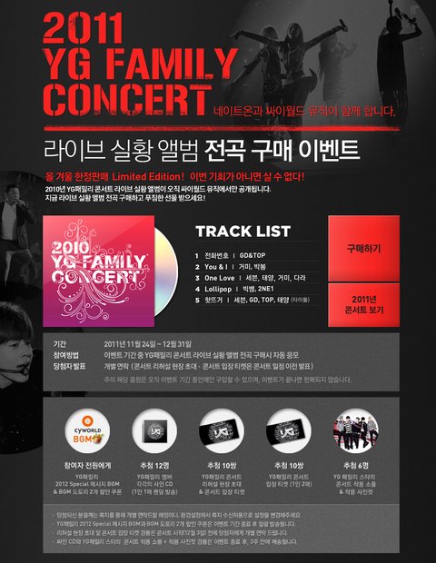 - 상품 : 2011 콘서트 초대권, 리허설 관람권, 싸인CD, 콘서트 착용소품+착용컷, 100% 당첨 경품인 YG스타들의 2012 행운의 BGM 메시지와 할인 쿠폰까지~!