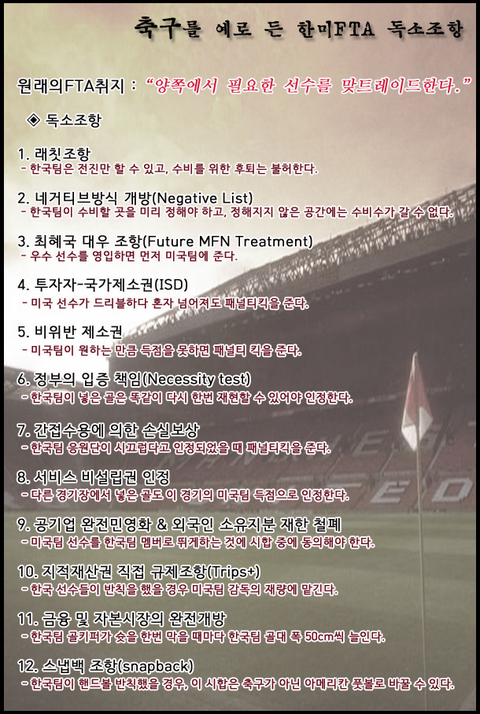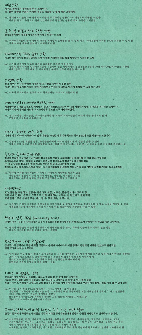 1) 래칫조항 : 어떠한 경우도 되 돌릴 수 없다 2) 네거티브방식 개방 : 개방할 사업이 아닌 개방하지 않을 사업만 정해둔다, 미래에 생겨날 새로운 사업은 무조건 개방한다 3) 최혜국 대우 : 다른나라와 협약을 맺을경우 자동으로 미국에도 혜택이 가게 한다 4) 투자자 국가 제소권 : 미국기업이 자신들 사업에 방해가 되는 한국 정부의 법과 제도를 제소하여 없앨 수 있다 (※ 미국의료기업이 한국의 국민의료보험공단을 제소할 수 있게 된다 → 의료보험 폐지 → 결과 '맹장수술900만원' + a) 5) 비위반 제소 : 자기들의 잘못으로 돈을 못벌었더라도 한국을 제소해서 막대한 배상금을 타낼 수 있다 6) 정부의 입증 책임 : 어떠한 규제의 필요와 불필요를 과학적으로 입증하지 못하면 무조건 개방한다 7) 간접수용에 의한 손실보상 : 미국인은 한국 법 보다 FTA 조항을 우선으로 둔다 (불법을 저질렀어도 보호 받을 수 있다) 8) 서비스 비설립권 인정 : 사업장을 한국에 설립하지 않아도 장사 할 수 있다 (한국 법으로 처벌 불가능 하다) 9) 공기업의 완전 민영화 : 돈돈돈 돈 잔치가 벌어지겠꾸나 전기세 폭등 기름값 폭등 의료비 폭등 물세 폭등~ 에헤라디야~ 나 그지 너 그지 에블바디세이 그지~ 10) 지적재산권 직접 규제 : 한국인과 한국기업에 대한 지적재산 소유권은 전부 미국이 갖는다 (네티즌 올 고소 = 징역) 11) 금융 및 자본시장의 완전 개방 : IMF는 우리의 친구지예 12) 재협상 불가 조항 : 위의 11가지 조항은 어떠한 경우에도 재협상 할 수 없다 위 조항들은. 미국 의회 '만장일치 통과' 한국 의회 '거대 여당(한나라당)이 직권상정 준비 중'