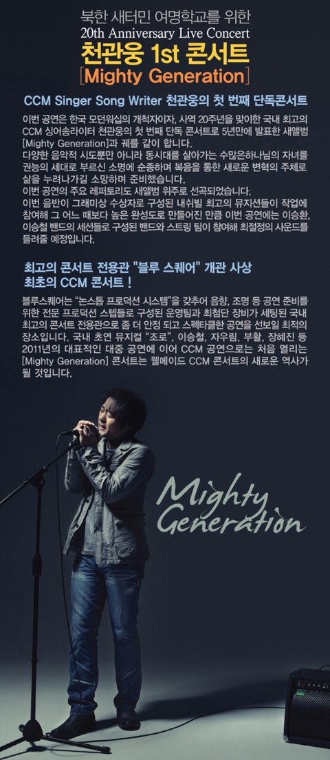 이런 여명학교를 돕기 위한 천관웅 콘서트가 오는 12월 20일 한남동 블루 스퀘어에서 열립니다.