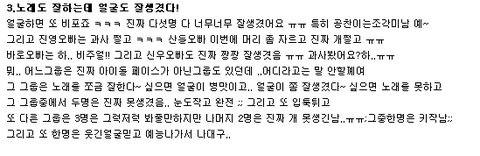 근데 난 노래못하고 얼굴 삐까번쩍한놈들보다는 얼굴 좀 안되도 노래는 캐잘하는 가수가좋음ㅋㅋㅋ