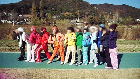18명의 아이들이 각각 다른색으로 위아래 깔맞춤을 하고서...