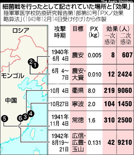 ↑ 세균전을 실시했던 장소와 효과. ( 아사히신문. )