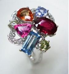 다이아몬드, 보라색 사파이어, 파보라이트, 가넷, 탄자나이트가 화이트골드에