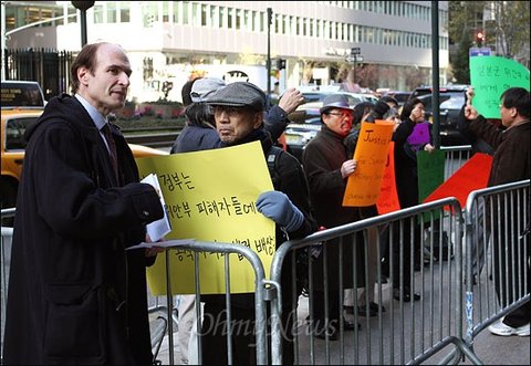 14일 낮 12시(현지시각) 미국 뉴욕 맨해튼 주재 일본총영사관 앞. 점심 약속 시간에 늦지 않기 위해 바쁜 걸음을 옮기던 앨렌 제이머(57)씨가 가던 길을 멈추고 돌아섰다. 건물 앞에 몰려있는 10여명의 한국인들이 들고 있던 피켓이 그의 발목을 잡은 것이다. 피켓에는 '일본 정부는 위안부 강제동원 피해자들에게 사죄하라'는 문구가 쓰여 있었다.