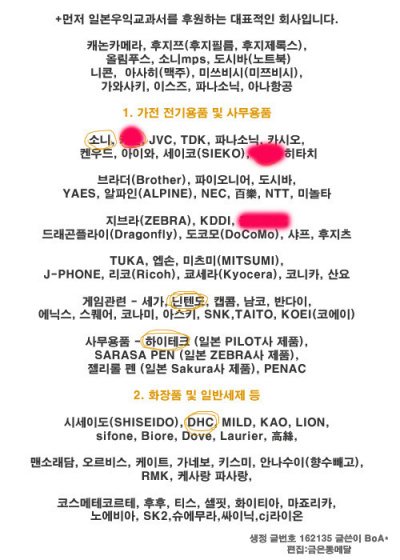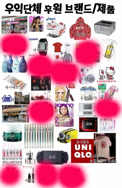 이렇게 우리가 우익을 후원하는 브랜드의 제품을 사면 우익세력이 죽지않고 더욱더 활기차게 활동하게 할수있도록 지원해주는거나 다름이없어. 그 브랜드가 잘되면 우익에게 더많이 후원 해주기 때문이야. 우익이 힘을 얻어 제대로 활동하게된다면 독도뿐만 아니라 우리에게 불리하게 작용될수있는것들이 아주 많아 그렇기때문에 절대적으로 쓰지말자 라고는 할수없겠지만