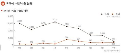 우리나라 유색석 수출은 줄었지만, 수입은 감소하다가 다시 증가하고 있는거 보이시나요?