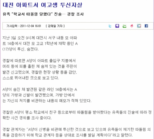 여고생 자살에 대한 내용은 12월4일 날자에 기사가 올라왔지만.