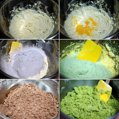 반죽을 합니다~ 기본 쿠키반죽에 코코아가루와 녹차가루만 추가했어요.