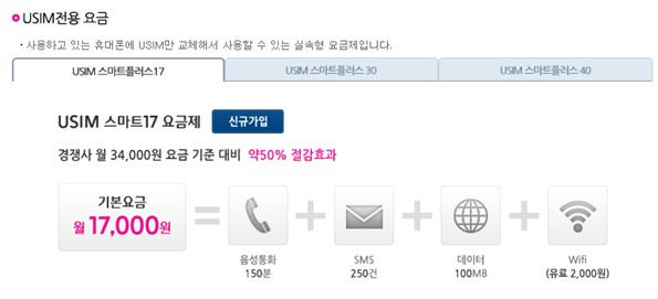 단말기를 교체하지 않는다면 가장 저렴한 월 1만7천원짜리 요금제도 선택할 수 있대요!
