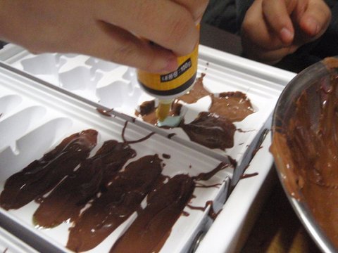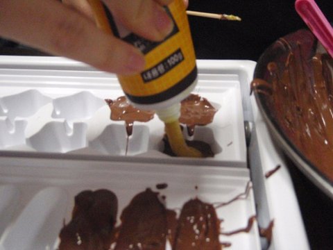 틀에 초컬릿을 베라 숟가락으로 떠 담기 시작했뜸 ㅋㅋ