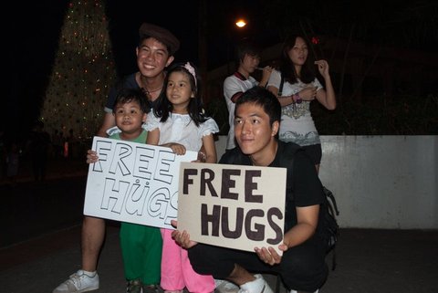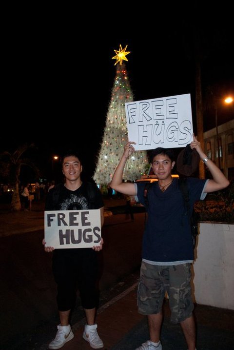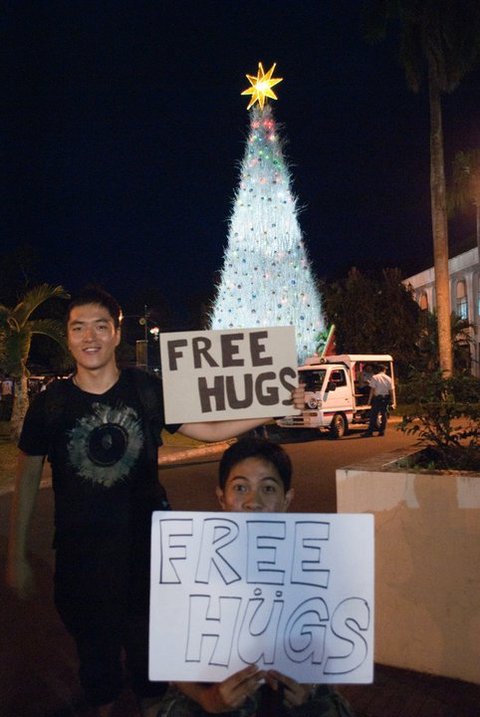 크리스마스 트리 앞에서 프리허그. 반팔 반바지의 프리허그.