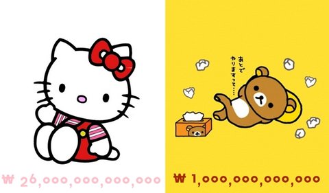 이번엔 헬로키티와 리락쿠마의 자산가치를 볼까요? 최신자료는 안타깝게 구하지 못했고, 2009년 자료에 의하면 헬로키티의 자산가치는 한화로 약 26조원!!!이나 된다고 해요. 정말 대단한 수치죠?