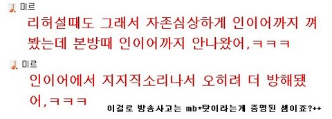 본방때 대비로 인이어를꼇는데 그것마저도 지지직거려 더불편했다고 하더군요