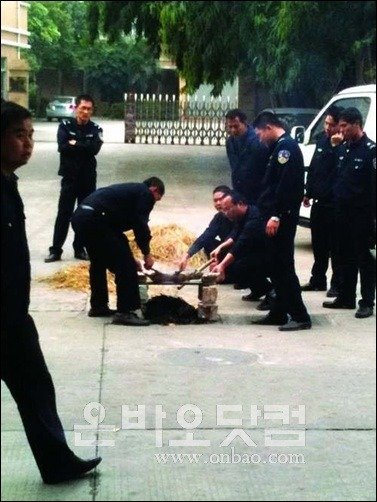 중국 경찰들이 경찰서 앞에서 고양이를 잡아 굽는 사진이 인터넷에 공개돼 논란이 일고있다.