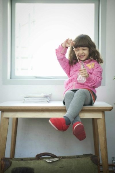 나비가 그려진 핑크 후드점퍼에 스커트, 거기에 보온성을 강조한 레깅스와 편해보이는 빨간 반스 클리피