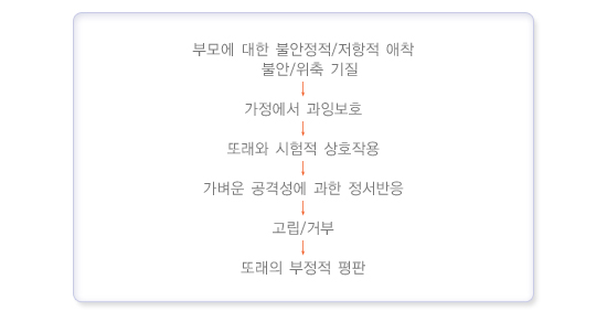 그리고 왕자병, 공주병으로 일컬어지는 아이들 역시 도발적 피해자 유형이 되기 쉽습니다. 이들은 ‘잘난 체하는’ 행동 특징을 보이고, 자기본위로 행동하는 경향이 있습니다. 그러다 보니 타인과 공감을 이루지 못하고 자신의 문제를 인식하지 못해서 아이들로부터 소외 당하게 됩니다.