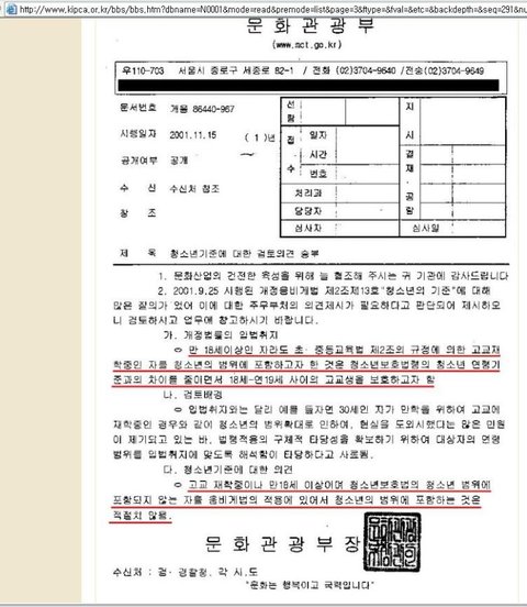 노래방이나 PC방에 대해서 답변한 것은 아니지만 동일한 입법취지로 법이 만들어 졌으며 예전엔 음비게법 통합 법일 때는 같은 법률로서 주무부처도 동일하였고 나중에 개별적인 산업으로 법이 분류가 나누어지긴 했지만 법구문이 예전과 토시하나 바뀌지 않고 그대로 동일합니다. 즉, 동일 주무부처에서 동일 구문에 대한 해석은 같다고 볼수도 있으며, 위쪽에 문광부 질문/답변 내용에서 구문은 같지만 나뉘어진 다른 산업에 대한(게임관련법, 영상 상영관련법, 노래방 관련법등) 내용을 포함하여 답변한 것을 볼수 있습니다. 아래의 질문/답변에서 영화 및 비디오 진흥에 관한 법률적 해석이니 PC방과 상관 없다는 둥 노래방과 상관없다는 둥 하는 소리 하지 마시기 바랍니다.