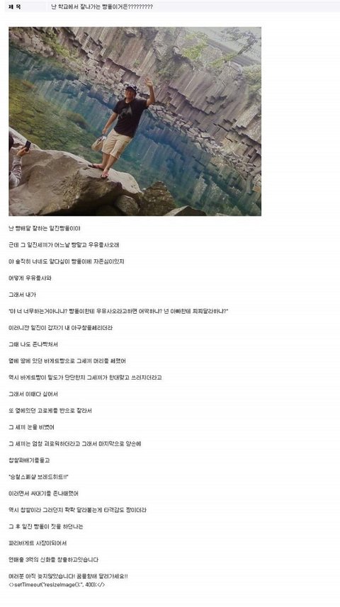 폰으로 보시는분^^ 난 빵배달 잘하는 일진빵돌이야 근데 그 일진새끼가 어느날 빵말고 우유를 사오래 야 솔직히 너네도 알다싶이 빵돌이에 자존심이있지 어떻게 우유를사와 그래서 내가 "야 너 너무하는거아니냐? 빵돌이한테 우유사오라고하면 어떡하냐? 넌 아빠한테 찌찌달라하냐?" 이러니깐 일진이 갑자기 내 아구창을쎄리더라 그때 나도 조카 빡쳐서 옆에 땅에 있던 바게트빵으로 그새끼 머리를 쎄렸어 역시 바게트빵이 밀도가 단단한지 그새끼가 한대맞고 쓰러지더라고 그래서 이때다 싶어서 또 옆에있던 고로케를 반으로 잘라서 그 새끼 눈을 비볐어 그 새끼는 엄청 괴로워하더라고 그래서 마지막을 양손에 찹쌀꽈배기를 들고 "승철스폐샬 브레드히트!!" 이러면서 싸대기를 조카때렸어 역시 찹쌀이라 그러던지 쫙쫙 달라붙는게 타격감도 짱이더라 그후 일진 빵돌이 짓을 하던 나는 파리바게트 사장이 되어서 연매출 3억의 신화를 창출하고있습니다 여러분 아직 늦지 않았습니다! 꿈을 향해 달려가세요!! ----- 처음알았는데 조ㄴ나라고 쓰면 조카라고뜨는구나.. ----- 베플됬네요 ㅋㅋㅋㅋㅋㅋㅋㅋ댓글들이 다 조카라니..