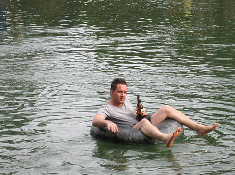 라오스 유적지 호수에 튜브와 맥주들고 들어간 서양인.