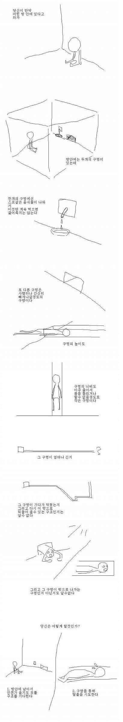 다음날 우리는 스프로 배를 채운 뒤, 어제 말했던 대로 방에 있는 물건들을 확인했다. 극단적으로 단순한 구조의 방이었기에 어려울 건 없었다. 방에는 전등 스위치와 스프 투입구, 그리고 작은 수도꼭지가 전부였다. 우리는 그것들로 가능한 조작방법을 고민했다. 먼저 입을 연 것은 수정이었다.