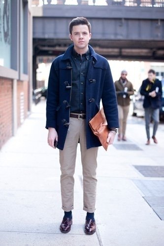 네이비 더블코트 + 녹색체크셔츠 + 베이지 슬렉스 + 양말 + 워커