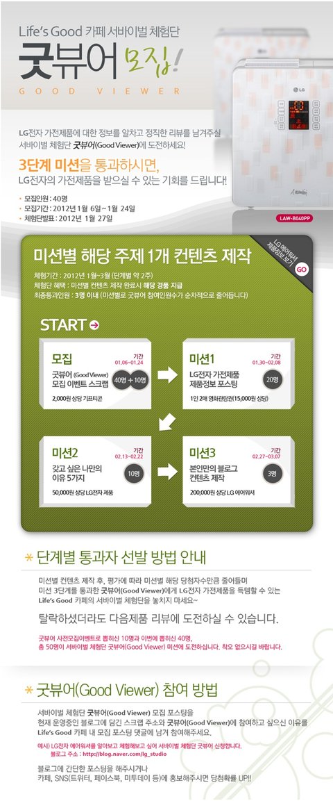 지금 LG Life's Good 카페에서 진행중인 서바이벌 체험단 굿뷰어(Good Viewer)에 도전해보세요.