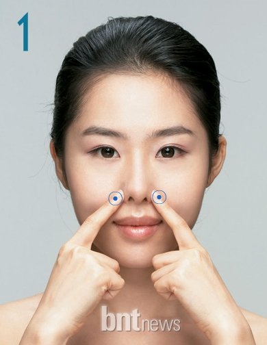 양 검지로 콧방울 옆(영향)을 3초간 지그시 누른다. 5회 반복
