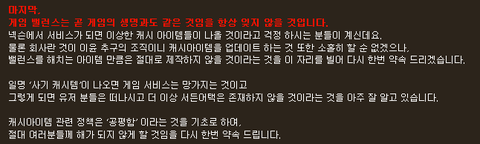 캐시아이템 관련 정책은 ‘공평함’ 이라는 것을 기초로 하여,