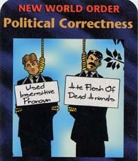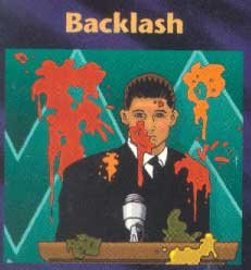 네, 이 카드는 '정치적 교정(矯正: 바로잡음)'이라는 카드입니다. 교수대에 목이 매달린 두 정치인의 죄목은 각각 '......한 형용사를 사용했다(죄송합니다 글씨가 안 보여서)'와, '죽은 동물의 고기를 먹었다'라는 황당한 것들입니다.