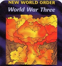 말할 것도 없이 이건 세계무역센터(쌍둥이 빌딩)에 가해질 테러를 묘사하고 있습니다. 2001년에 일어날 일을 미리 예언한 것입니다. 하단에 씌여있는 말들의 번역은 다음과 같습니다. "이 카드를 어느 때고 이용함으로써 당신은 당신이 콘트롤하는 무력(폭력) 집단에 대해 +10의 힘 혹은 저항력을 얻는다(뒤는 생략. 의미심장하지만)"