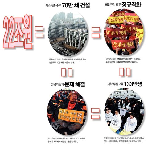 튼튼한 자주 국방을 위한 최신식 스텔스 전투기 구입비용이 8조 원에 불과하지만, 2016년까지 5년의 시간이 필요한 사업입니다. 8조 원이 적은 돈이 아니기 때문입니다. 그런데 이대통령은 22조 원이 넘는 돈을 2년 만에 강물에 떠내려 보냈습니다.