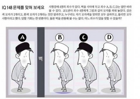 사형장에 4명의 죄수가 있다 벽을 사이에 두고 죄수 A.B.C.D는 앞만 바라볼 수 있다. 교도관이 죄수 4명에게 그림과 같이 모자를 씌워 놓았다. 검은색 모자가 2개이고, 흰색모자가 2개라는 것만 알려주고, 누구라도 자기 모자색을 맞히면 모두 살려주고 틀리면 모두 사형이라고 했다. 답할 기회는 한번뿐이다. 물론 벽을 관통해 볼 수는 없다. 어느 죄수가 답을 맞힐 수 있을까?