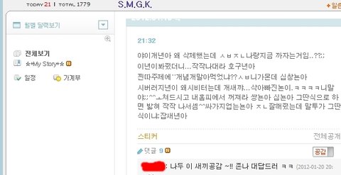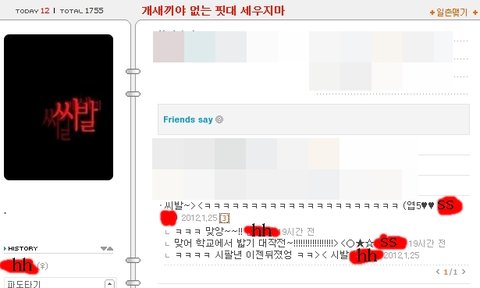hh의미니홈피임 이새끼는맨날귀척질쩜.얼굴도그렇게이쁘지도않은게 욕하는것도귀척질임