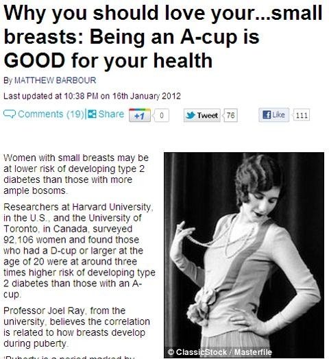 미국 하버드대와 캐나다 토론토대 공동 연구팀은 총 9만 2,106명의 여성을 조사해 D컵 이상인 여성이 A컵 여성보다 추후 제2형 당뇨병에 걸릴 위험이 3배 이상 높다고 밝혔다.