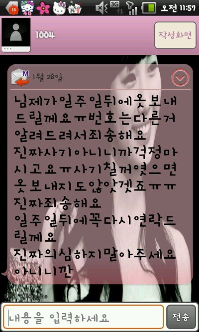 제가 근데 그사람이 제번호만알고 그사람은 번호도 안알려주시고 카톡으로만 하고 주소지도 할머니가 대신 받아주셔야한다면서 경로당으로알려주심;;ㅋ자기는기숙사생활을한다고함ㅋㅋ