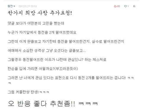 안녕하세요 열일곱살 아니다올해 열여덟살되는 여잔데요ㅋㅋㅋ아미치겠어요 제가오늘 주머니달린 니트안에 동전 이거 써볼라고 지나가다가 사람잇으면 써먹을생각에 주머니에 백원짜리 두개넣어놓고 다녓는데 편의점을갓는데 그냥좀 평범? 근데제스타일은 아닌남자가있더라고요 근데 제가 컵라면사가지고 들ㄹ고뛰어가다가 동전이 두개다떨어졋는데 남자가 힐끔저보더니 지갑에서 동전을 꺼내서 떨어뜨리는거에요ㅋㅋㅋㅋㅋㅋㅋㅋㅋㅋ