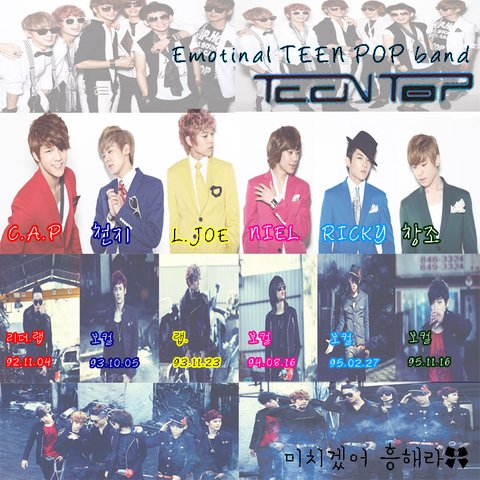 틴탑은 캡.천지.엘조.니엘.리키.창조 로 구성된 6인조보이그룹입니다!