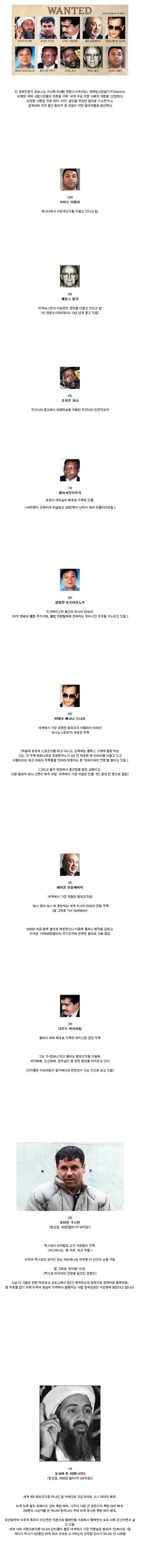 ㅜㅜ쓰느라손아픔..추천좀 ---------------------------------------- 미 경제전문지 포브스는 지난해 미 연방수사국,국제형사경찰기구를 비롯한국제 사법기관들의 자문을 구해 '세계주요지명수배자10명'을 선정했다.선정된 10명은 주로 테러,마약,살인을 주도한 혐의로 기소됐거나,공개리에 추적 중인 범죄자 중 죄질이 악한 용의자들로 엄선됐다. 10위 오미드 타빌리캐나다에서 이란게조직을 이끌고 있다고 함. 9위 제임스 벌거미국 보스턴의 아일랜드 갱단을 이끌고 있다고 함.(미 연방수사국(FBI)이 10년넘게쫓고있다.) 8위 조지프 코니우간다와 콩고에서 대량학살을 자행한 우간다의 반군지도자 7위 팰리시안카부가르완다 대학살의 배후로 지목된 인물.(100만명이 잔혹하게 학살되고 200만명이난민이되어 떠돌아다녔음.) 6위 알림잔 토흐타호노프우즈베키스탄 출신의 러시아 마피아.(마약 분배와 불법 무기거래, 불법 차량밀매에 관여하는 유라시안조직을 거느리고있다.) 5위 마테오 메시나 드나로세계에서 가장 유명한 범죄조직 이탈리아 마피아 '코사노스트라'의 새로운 두목. (독일제 포르쉐 스포츠카를 타고 다니고, 손목에는 롤렉스 시게에 열광하는 그는,전 두목 베르나르도 프로벤차노가 2년 전 체포된 뒤 마피아를 이끌고 있고이탈리아는 최근 마피아 두목들을 잇따라 체포하는 등 '마피아와의 전쟁'을 벌이고 있음.그리고 궐석 재판에서 종신형을 받은 상태고 다른 범죄자보다 신변이 매우 위험하여 '세계에서가장 위험한 인물 5인중의 한명으로 꼽힘) 4위 세미온 모길레비치'세계에서 가장 위험한 범죄조직원' '보스중의 보스'로 표현되는 세계러시아마피아연합두목.(말그대로 The Godfather)2008년 세금탈루혐의로 체포됬으나 이듬해 풀려나 행적을 감췄고, 미국은 1억5000만 달러의주가조작에 연루된 혐의로 수배중임. 3위 다우드 이브라힘뭄바이 테러 배후로 지목된 파키스탄 갱단 두목그는'D-컴퍼니'라고 불리는 범죄조직을 이끌며, 마약,인신매매 청부살인 등 모든범죄를 저지르고 있다. 2위 호아킨 구스만 (현상금 약 54억원) 멕시코의 마약범죄 조직 카르텔의 두목. 외신에서는 '엘 차포'라고 부름.미국과 멕시코의 코카인 또는 마리화나는 대부분 이 인간 손을 거친다.말그대로마약왕이죠. 멕시코 마약과의 전쟁을 일으킨 장본인.사실 이 사람은 한번 체포되고 교도소에서 8년간 복역했는데 트럭으로 영화처럼 탈옥.엘 차포를 잡기위해 미국과 중남미지역에서 활동하는 사법 당국요원만 수천명에 달한다고 합니다. 1위 오사마 빈 라덴(사망) (현상금 약 266억원) 세계 4대 테러조직 중 하나인 알 카에다의 지도자이며, 9.11테러의 배후.미국 뉴욕 월드 트레이드 센터 폭탄 테러, 사우디 다란 군 훈련기지 폭탄 테러 배후,200명의 사상자를 낸 케냐와 탄지니아 주재 미국 대사관 폭탄 테러 배후.청년때부터 석유국 특유의 미친듯한 자본으로 탈레반을 지원해서 탈레반의보호 아래 은신하면서 살고있음. 세계10대지명수배자뿐 아니라 인터폴이 뽑은 세계에서가장 악명높은 범죄자7인에서도 1등, 게다가 부시가 6년동안 세계최대규모로 조사했는데추적할 단서가 하나도 안나왔음.