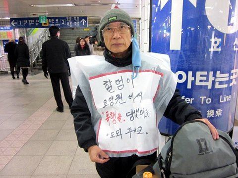 할아버지께서는 적절한 대안을 찾지 못해 2호선 신도림역에서 이 추운날씨에 혼자 도움을 요청하고 계십니다.