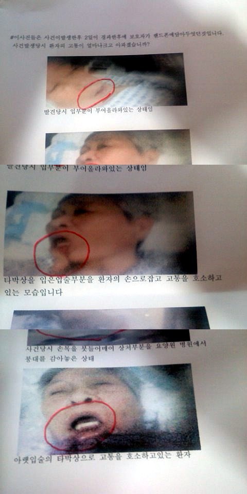 밤중에 이루어진 일이라 현장을 목격한 사람은 병실을 보살피고있는 요양사와 간호사들 밖에는 없습니다. 그러나 환자가 상처투성이로 실신상태에 빠져있는 현장을 경찰관 두분이 목격하였고 보호자가 환자의 상처부위를 사진으로 보관되여 첨부하였읍니다 이와같은 반일륜적이고 참혹한 일들은 저 개인 차원을떠나 대한민국 노인들의 생존권에관한 문제이며 더나아가 사회적인문제이고 공공의 문제라 생각되옵니다 이문제가 널리알려저서 저와같은 피해자가 더 이상 발생하지 않도록간절히 기도하는 마음으로 이글을 올립니다