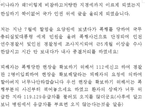 할아버지께서는 자신이 프린트한 종이를 들고 계셨습니다. 자세히 읽어보니 요양원에서 할머님이 무차별 폭행을 당했고, 국가인권위원회를 비롯한 국가권익위원회 국민신문고에 아무리 글을 올리고 호소를 하여도 아무런 소용이 없어 어떠한 보상도 받지 못한 상태라고 합니다.