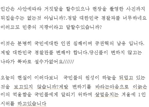 전 할머니 할아버지와 같이 살아서 정이 더 많은 편이지만 요양원은 잘 모릅니다. 그래서 침대에서 얼마나 격렬하게 몸짓을 했길래 몸에 저런 상처가 든다는 건지는 잘 이해되지가 않아요. 그리고 할아버지가 돈을 목적으로 시위하고 계신다고 생각하고 싶지도 않구요. 그런분이 새벽부터 시위하러 나가실까요? 만약 님들 말이 허황된 추측이라면 할아버지께 얼마나 상처가 될지는 생각 안해보셨어요?